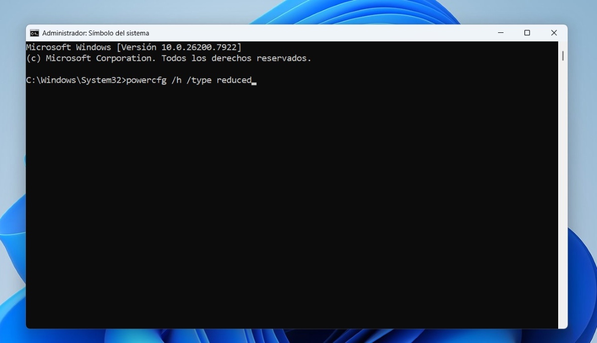3. Para reducir el tamaño del archivo Hiberfil.sys sin dejar de usar la hibernación o el Inicio Rápido, ejecuta el comando powercfg /h /type reduced.