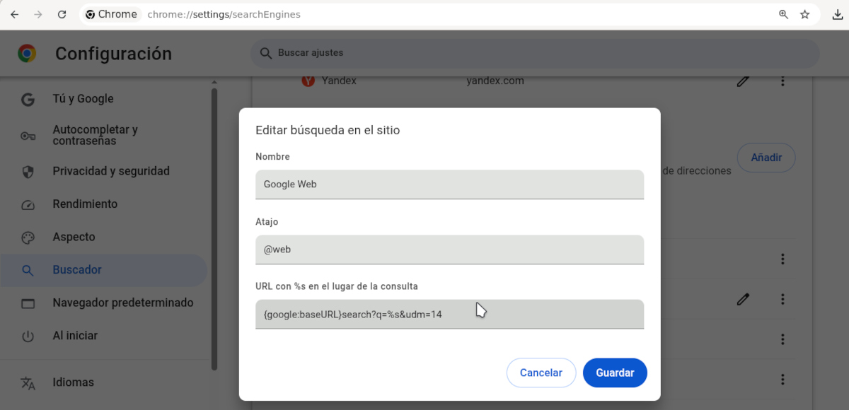- Abre Chrome y ve a chrome://settings/searchEngines