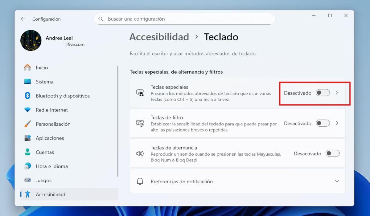 Con esto, aunque presiones la tecla Shift cien veces, no pasará nada. Ahora bien, si después necesitas activar las teclas especiales, será necesario que sigas la ruta del paso 1 y actives el interruptor para Teclas especiales.