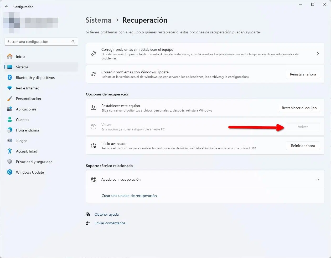 Mientras el plazo de reversión esté activo, verás el botón Volver en Configuración > Sistema > Recuperación (Windows 11) o en Configuración > Actualización y seguridad > Recuperación (Windows 10). Si ese botón ya no aparece, el periodo ha caducado y no podrás deshacer la actualización por la vía estándar.