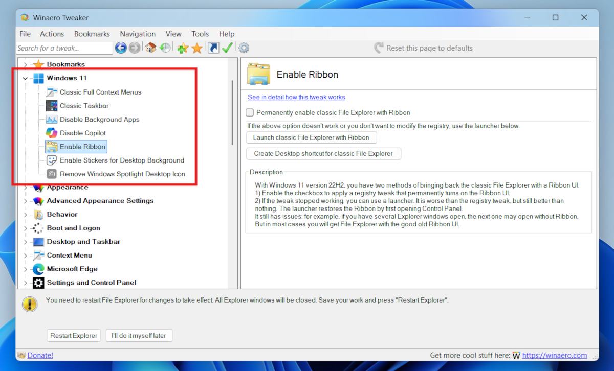 - Habilitar el menú de cinta en el Explorador de archivos, en vez del menú de pestañas que trae por defecto Windows 11.